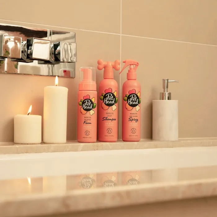 ¡Presentamos la solución definitiva para las necesidades de aseo de tu amigo peludo - ¡Spray Seco de Champú para Mascotas Pet Head Quick Fix Perro Durazno (300 ml)!