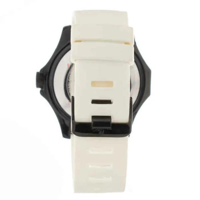 El reloj tiene una duradera correa de silicona que es cómoda de llevar y proporciona un ajuste seguro. La correa blanca se acentúa con una caja de reloj negra que añade un toque de sofisticación al diseño general. La esfera del reloj también es blanca, lo que le da un aspecto clásico y atemporal.