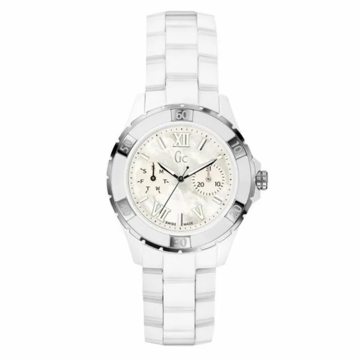 El material de la pulsera está hecho de cerámica, lo que le da al reloj un aspecto sofisticado y elegante. El color de la correa y el color de la caja del reloj son ambos blancos, lo que añade a su apariencia esbelta y pulida. El color de la esfera del reloj es una combinación de blanco y nácar, que crea un efecto único y llamativo.