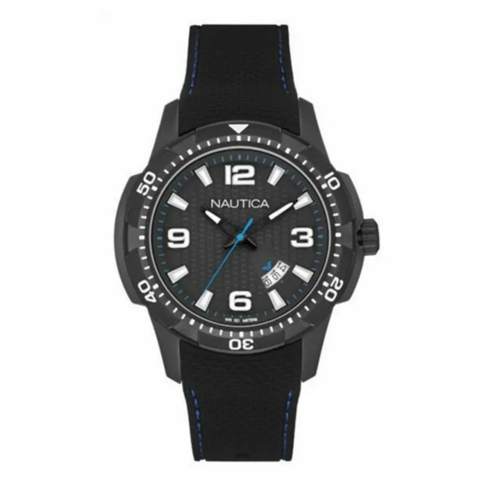 El Reloj de Hombre Nautica NAI13511G es una asombrosa pieza que combina estilo y funcionalidad. Con su elegante brazalete de silicona negra y su caja de reloj negra a juego, este reloj hará una declaración audaz en tu muñeca. La esfera del reloj también es negra y presenta marcadores de hora y manecillas blancas, lo que facilita la lectura de la hora de un vistazo.