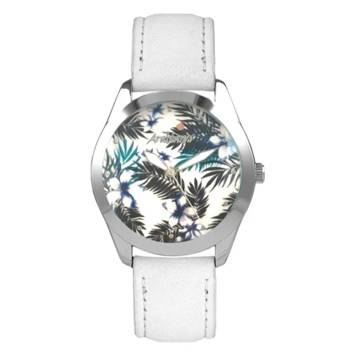 La correa de cuero blanco es increíblemente suave, ajustándose cómodamente alrededor de tu muñeca con un cierre de hebilla para un ajuste seguro. El cristal está hecho de mineral, proporcionando una superficie resistente a los arañazos que mantendrá tu reloj luciendo como nuevo durante años.