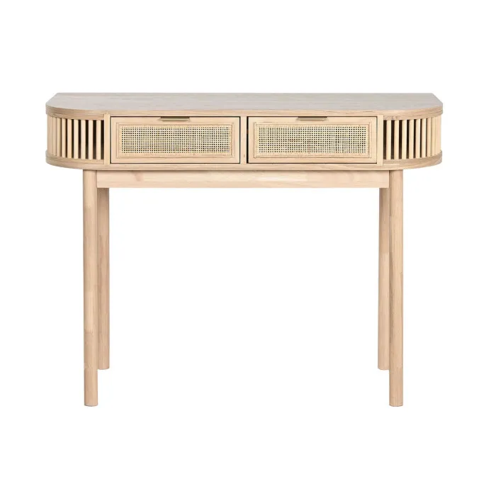 La combinación armoniosa de materiales duraderos, específicamente el rattán y el abeto, asegura que esta consola sea tanto resistente como estéticamente agradable. El rattán, conocido por su resistencia y ligereza, proporciona una base sólida para la consola, mientras que la madera de abeto añade una rica textura y calidez. Esta mezcla cuidadosa no solo la convierte en una pieza de muebles que durará años, sino que también armoniza bellamente con varios elementos de diseño, desde lo tradicional hasta lo contemporáneo. Las dimensiones de 100 cm de ancho, 40 cm de profundidad y 76 cm de altura la hacen del tamaño ideal tanto para la funcionalidad como para el estilo, permitiendo que se integre perfectamente en cualquier espacio.