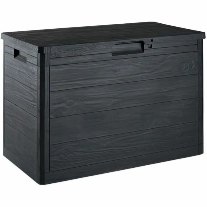El color negro del cofre añade un toque de sofisticación moderna a la decoración de tu patio, y el diseño elegante permite que se integre perfectamente con cualquier estilo. Con unas medidas de 77.5 x 44.5 x 52.7 cm, este cofre es lo suficientemente espacioso como para almacenar lo que necesites, manteniéndose compacto para caber en esquinas estrechas o balcones pequeños.