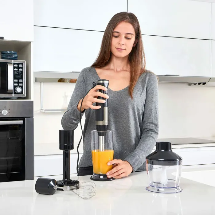 La Batidora de Mano Black & Decker ES9160080B Negra 1500 W es un electrodoméstico imprescindible para cualquier persona que busque elevar su experiencia culinaria. Su potente motor de 1500 W garantiza que puedas mezclar, picar y hacer puré con facilidad, haciendo que la preparación de las comidas sea más rápida y eficiente. Esta versátil batidora de mano no solo es compacta, sino que también está diseñada para atender una variedad de tareas culinarias, incluyendo hacer batidos, sopas, salsas y hasta comida para bebés. Con 20 configuraciones de velocidad diferentes a tu disposición, tienes el control total sobre la textura de tus ingredientes, ya sea que desees un picado grueso o un puré fino.