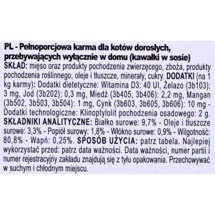 No solo esta comida para gatos está llena de nutrientes esenciales como yodo, vitamina D3, manganeso y zinc, sino que también tiene un sabor a carne irresistible que los gatos no pueden resistir. Y con 12 convenientes paquetes de 85 g, puedes proporcionar fácilmente a tu gato una dieta consistente y equilibrada.