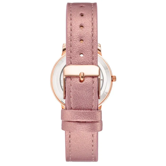 El reloj cuenta con un movimiento de cuarzo confiable, asegurando que siempre llegues a tiempo mientras disfrutas de la precisión que viene con esta tecnología. El cristal mineral proporciona durabilidad y resistencia a los arañazos, protegiendo la pieza de las desgastes diarios. En cuanto a los materiales utilizados, la caja de metal encierra la intrincada mecánica del reloj mientras que la suave correa rosa no solo añade a la estética general, sino que también asegura un ajuste cómodo en tu muñeca. El mecanismo de cierre de hebilla es fácil de usar, proporcionando seguridad y conveniencia sin comprometer el estilo.