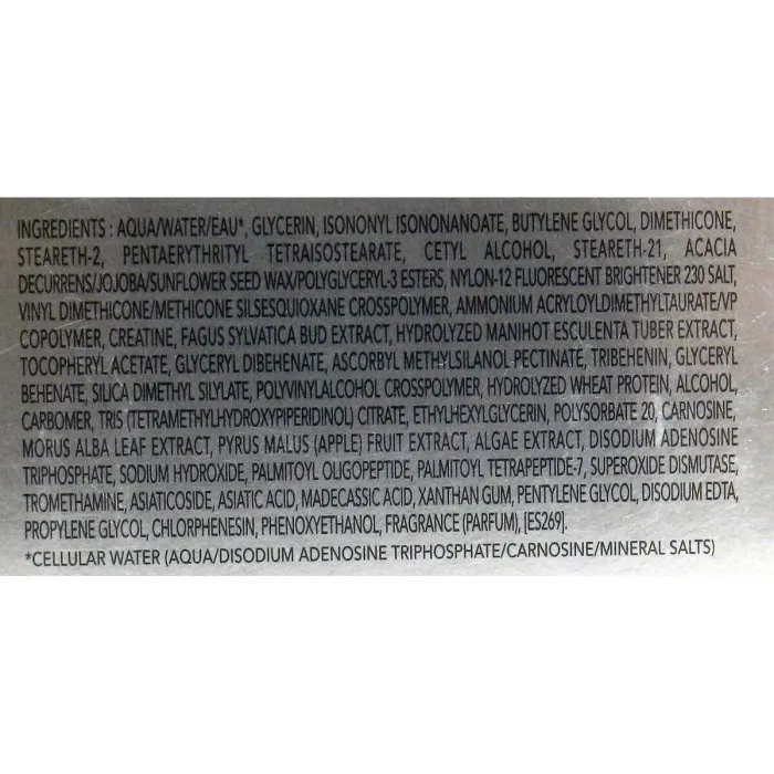 Polysorbate 20, Propilenglicol, Sodium hydroxide, Tocopheryl acetate, Butilenglicol, Carbomer, Carnosine, Disodium edta, Fragance (parfum), Glicerina, Alcohol, Fenoxietanol, Etilhexilglicerina, Dimeticone, Goma xantana