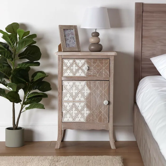 Una de las características más destacadas de la Mesita de Noche Versa Lyra es su impecable artesanía. Los intrincados detalles y curvas sutiles le dan un atractivo atemporal que es difícil de pasar por alto. Además, la combinación de madera de Paolownia y MDF contribuye a su durabilidad, asegurando que pueda resistir el desgaste diario.