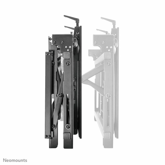 El soporte de pared Neomounts by Newstar LCD/LED/Plasma le permite montar un televisor LCD, LED o plasma a cualquier pared. Causa del patrón de orificios flexible de este sistema es el soporte de pared utilizable para casi todos los televisores de hasta 75" (191 cm). Este soporte de pared es fácil de instalar utilizando el patrón de agujeros VESA en la parte posterior de su televisor. Este soporte de pared puede ser usado cuando la distancia máxima entre los agujeros (de izquierda a derecha) es de 60 cm. Los orificios superior e inferior permiten una distancia máxima de 30 cm. - Soporte de pared Vídeo Pop-out - Función de Pop-out permite el acceso de liberación rápida - desplazamiento lateral soportes permiten la alineación rápida - Micro-ajuste a los 8 puntos para la alineación de pantalla transparente y el nivel - Bloquear y desbloquear el interruptor de mando para ayudar a la pantalla de bloqueo / desbloqueo del módulo de pop-out - Pata de cabra biedt 12° de inclinación para manejar los cables fácilmente y mantenimiento - El diseño antirrobo para mayor seguridad (requisito para un candado) - Protege las pantallas al suprimir la posibilidad de accidentales pop-outs a través de las piezas de plástico de bloqueo. Este soporte de pared está diseñado especialmente para ser utilizado en las paredes de vídeo. La pantalla puede ser fácilmente extraída.