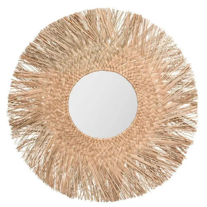 El color natural de los juncos complementa la superficie reflectante del espejo circular, creando un equilibrio armonioso que no solo sirve como un artículo práctico, sino también como una característica decorativa llamativa. Ya sea que elijas colgarlo en tu sala de estar, dormitorio o entrada, este espejo de pared realzará la atmósfera de tu hogar al reflejar la luz y crear una ilusión de un área más espaciosa. Su impresionante diámetro de 80 cm lo convierte en un punto focal perfecto, captando la atención y generando conversaciones entre tus invitados.
