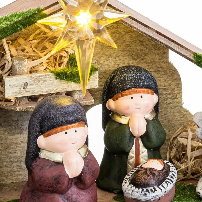 Para realzar su atractivo, este juego de nacimientos funciona con baterías e incluye una bombilla incorporada que ilumina hermosamente el escenario, creando una atmósfera cálida y acogedora. El conjunto no requiere ensamblaje, lo que te permite exhibirlo fácilmente en tu sala de estar, en una repisa, o incluso como un encantador centro de mesa en tus reuniones navideñas. Con unas dimensiones aproximadas de 22.5 x 8.5 x 16.5 cm, se adapta perfectamente a diversos espacios, siendo una elección versátil tanto para hogares grandes como pequeños. Este juego de nacimientos navideño no es solo una decoración; es una expresión sincera de fe, familia y la alegría de dar, convirtiéndolo en una pieza preciada para los años venideros.