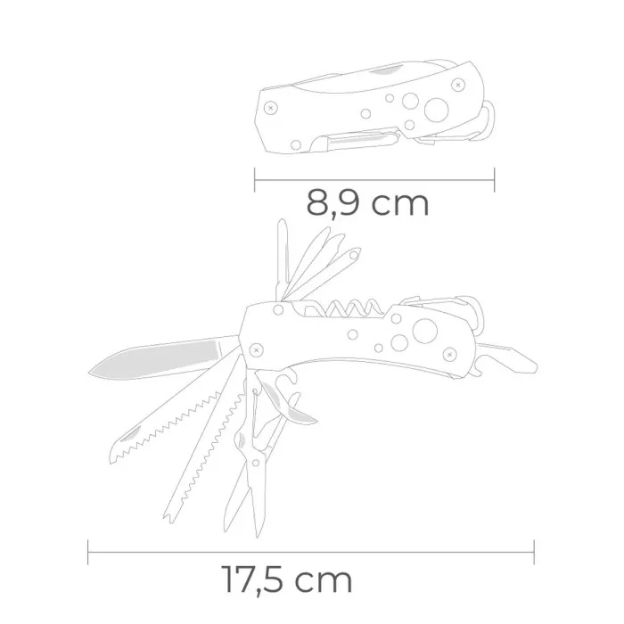 Abrelatas, Destornillador, Abrebotellas, Sierra, Mosquetón, Lima de uñas, Sacacorchos, Desescamador de pescado