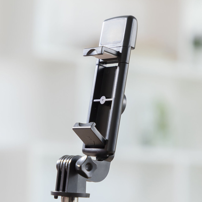 El soporte para móviles es ajustable (9,5 cm máx.), adaptándose a la mayoría de móviles. Tiene una rotación de 360º para colocar el móvil en posición horizontal o vertical. También dispone de inclinación regulable, pudiendo ajustar el ángulo hasta 270º para un encuadre óptimo de los planos al realizar las fotos y vídeos.