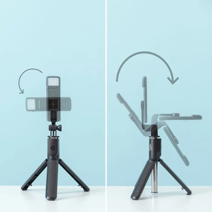 El trípode cuenta con un tubo metálico telescópico que es extensible para colocarlo a la altura deseada. Proporciona una firme sujeción para planos estables (sobre mesas, escritorios, estantes, etc.). Las patas se pliegan fácilmente para convertirse en mango y utilizarlo como palo selfie para la realización de selfies, la grabación de vídeos con planos en movimiento, etc.