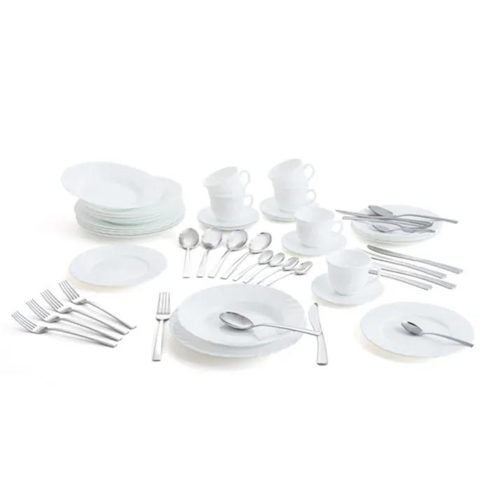 Plato Llano x 6 (Ã 24,5 cm), Plato de Postre x 6 (Ã 19,5 cm), Plato Hondo x 6 (Ã 22,5 cm), Tazas x 6, Cuchillo x 6, Cuchara de Postre x 6, Tenedor x 6, Cuchara x 6