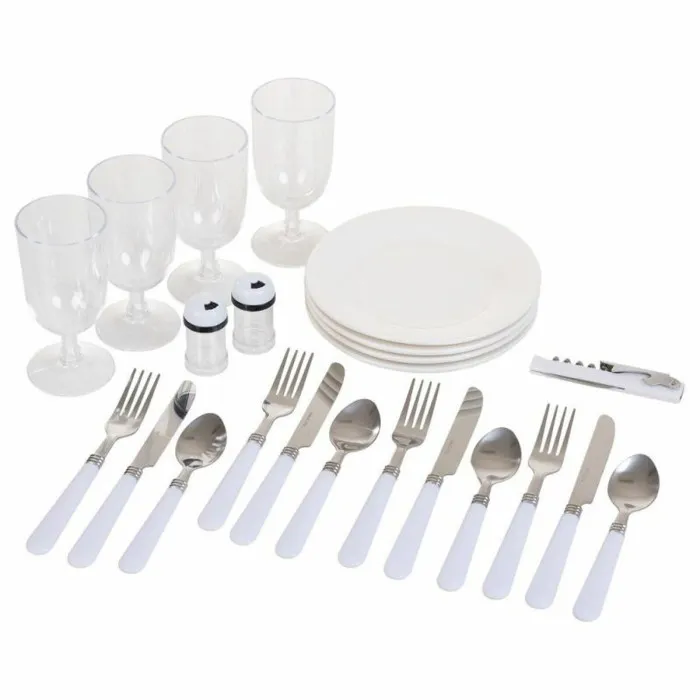 Cuchillo x 4, Salero y Pimentero, Cuchara x 4, Tenedor x 4, Plato x 4, Sacacorchos, Vasos x 4