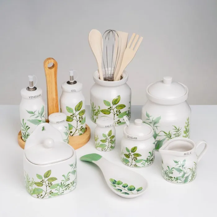 Bote para Utensilios de Cocina GREENS Madera Metal Gres 12 x 12 x 13 cm