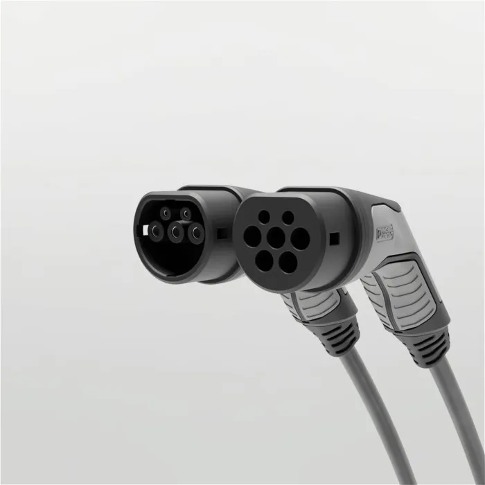 Este kit incluye manguera extraíble (cable de carga con conector) de carga monofásica Modo 3 de 32A, de 5 metros de longitud, compatible con todos los coches eléctricos y cargadores con conector Tipo 2 (manguera T2-T2). Incluye cubiertas para conectores.