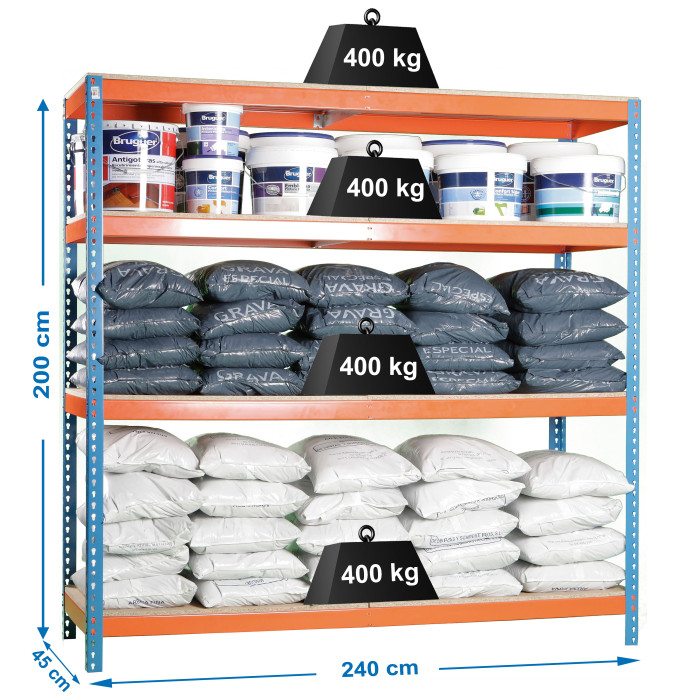 Con sus 4 robustas baldas de madera, esta estantería metálica proporciona una superficie sólida y fiable para almacenar una gran variedad de artículos. Cada balda puede soportar hasta 400 kg, lo que la convierte en una opción ideal para guardar herramientas pesadas en el taller de brico, cajas de archivo en la oficina, provisiones en el almacen, o incluso libros en una sala de estudio. La versatilidad de esta estantería metálica la hace adecuada para instalaciones domésticas y profesionales, desde pequeños trasteros hasta grandes almacenes.