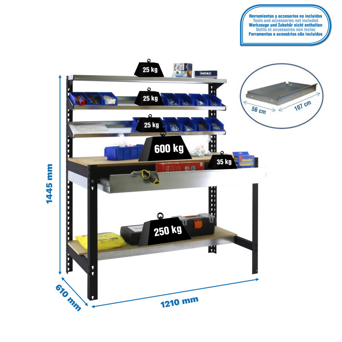Las 5 baldas de este banco de trabajo ofrecen gran versatilidad. Cada una soporta hasta 600 kg, lo que significa que puede guardar desde herramientas eléctricas pesadas, cajas de herramientas completas, hasta materiales de construcción, piezas de repuesto o pequeños electrodomésticos. Es un organizador de espacio excepcional para cualquier trabajo.