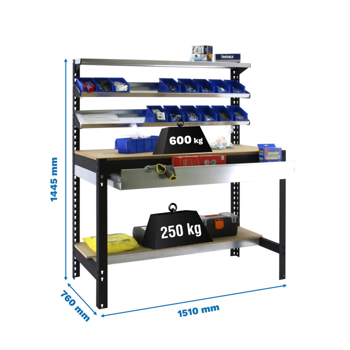 Las 5 baldas de este banco de trabajo ofrecen gran versatilidad. Cada una soporta hasta 600 kg, lo que significa que puede guardar desde herramientas eléctricas pesadas, cajas de herramientas completas, hasta materiales de construcción, piezas de repuesto o pequeños electrodomésticos. Es un organizador de espacio excepcional para cualquier trabajo.
