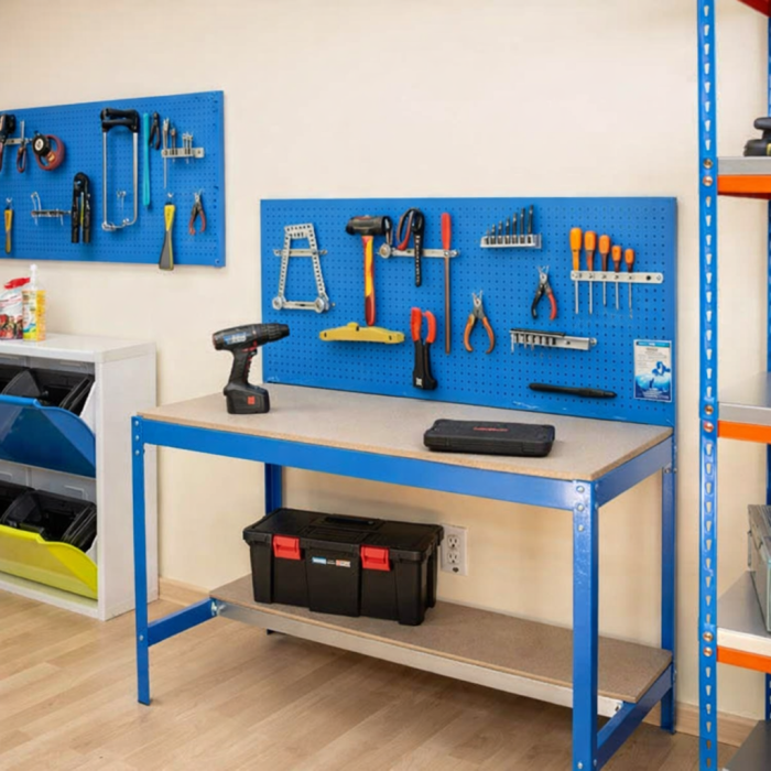 Dado que cada balda soporta hasta 600 kg, este banco de trabajo es adecuado para una amplia variedad de herramientas y materiales. Desde herramientas manuales y eléctricas hasta componentes más pesados para proyectos de carpintería o mecánica. Es una mesa sólida para cualquier tipo de trabajo, ideal para profesionales o para el carpintero que busca un espacio ordenado. Puedes usarlo para tu taller de madera o para trabajos de metal.