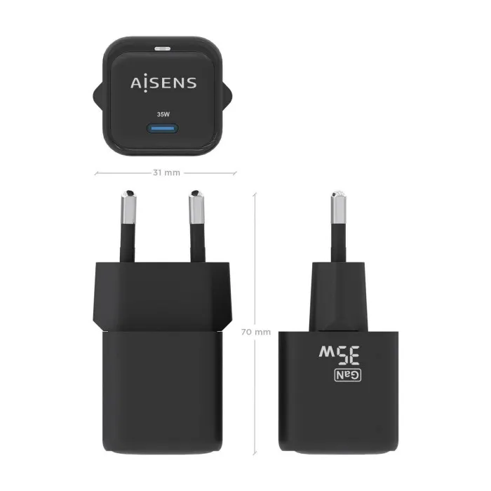Introducing the Wall Charger Aisens ASCH-35W1P023-BK Black 35 W (1 Unit), a cutting-edge power solution designed for modern electronic devices. With a sleek black finish, this charger not only offers functionality but also brings a touch of elegance to your charging setup. Equipped with advanced technology, it provides a rapid charging experience without compromising safety. The charger is built for universal compatibility, ensuring it can power a wide range of devices effectively. With an AC input of 100-240 V and a frequency range of 50-60 Hz, it is suitable for use in various locations around the globe, making it a perfect travel companion.