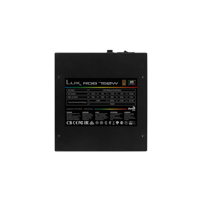 The Power supply Aerocool Lux RGB 750 W 80 Plus Bronze is a high-performance, reliable core component intended to power high-end desktop PC systems and cater to the requirements of power users, gamers, and overclocking enthusiasts. The power supply is designed to provide stable and consistent power delivery while keeping the noise levels to a minimum, thus offering an ideal solution for seamless and uninterrupted system performance.