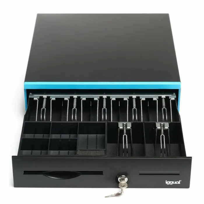 The Cash Register Drawer iggual IRON-30B Black Black/Blue is a state-of-the-art solution designed for businesses that prioritize efficiency and organization in their point-of-sale operations. With a sleek and modern design, this cash drawer not only enhances the aesthetic of your retail environment but also offers practical functionality that every business owner will appreciate. Its compact dimensions of approximately 42 x 40.5 x 10 cm make it a versatile choice that fits effortlessly into most countertop spaces, allowing for a tidy setup while ensuring that cash management remains efficient.