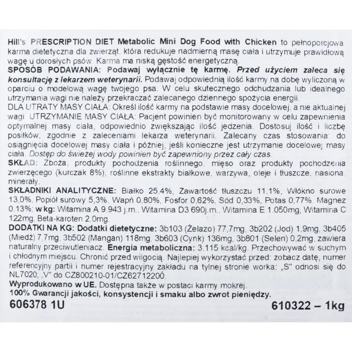 Introducing the Fodder Hill's Metabolic Mini Adult Chicken 1 kg, a specially formulated dietary solution designed for adult dogs, particularly those with a tendency to gain weight. This premium dog food offers a unique blend of ingredients that not only supports a healthy weight but also ensures that your furry friend receives all the nutritional benefits they need. With chicken as the primary flavor, it caters to the palate of your beloved pet, making mealtime a delightful experience while promoting overall well-being.