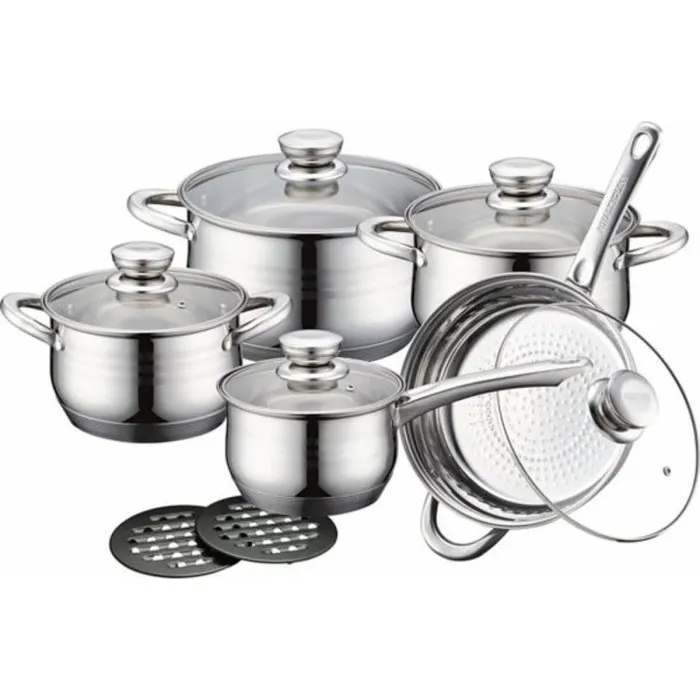 Introducing the Cookware Royalty Line 1232 Steel 12 Pieces, an essential culinary set designed for both amateur home cooks and professional chefs. When you think about renovating your kitchen, this exquisite cookware collection will undoubtedly elevate your cooking experience. Crafted with high-quality stainless steel, each piece ensures durability and superior heat distribution, making it perfect for a variety of cooking methods. Whether you're simmering, sautéing, or baking, this versatile set is sure to meet all your culinary needs. Embrace the joy of cooking with a modern design that enhances any kitchen aesthetic while allowing for easy handling and efficient cooking.