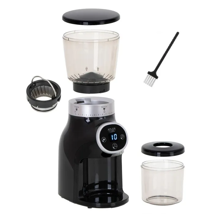 Constructed with high-quality materials, the Adler AD 4450 features a robust stainless steel body that not only enhances its durability but also adds a modern touch to your kitchen countertop. The ergonomic design ensures easy handling, making grinding a hassle-free task. The grinder's sleek, compact design allows it to fit seamlessly into any kitchen setup, while its plastic components facilitate easy cleaning and maintenance. Enjoy the convenience of easily grinding your own coffee beans, which enhances the flavor and aroma of your favorite brews.