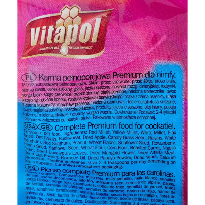 Nymphae, commonly known as cockatiels, are playful and social birds whose nutritional needs must be met to ensure they thrive. Bird food Vitapol Premium takes into account the specific dietary preferences of these birds, making it an ideal choice for your feathered friend. Investing in quality bird food means investing in your pet's health. Providing a diet rich in essential nutrients, without the worry of added preservatives, leads to happier and healthier birds. Let your cockatiels enjoy the taste of premium quality food that reflects your love and care for their well-being.