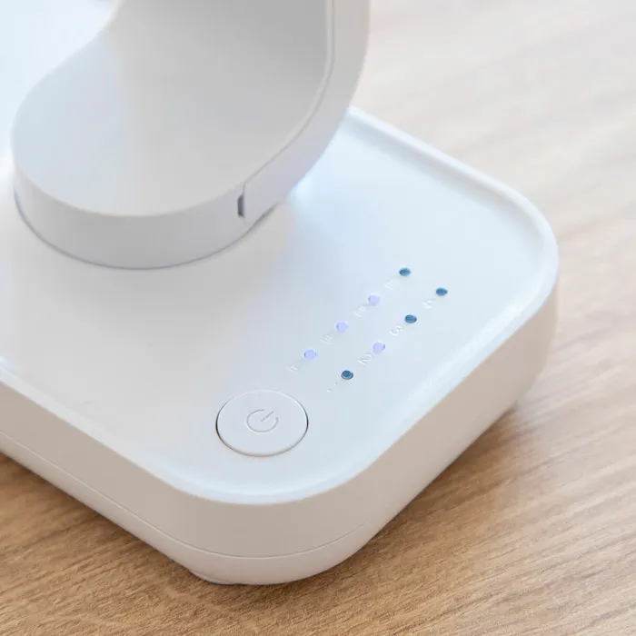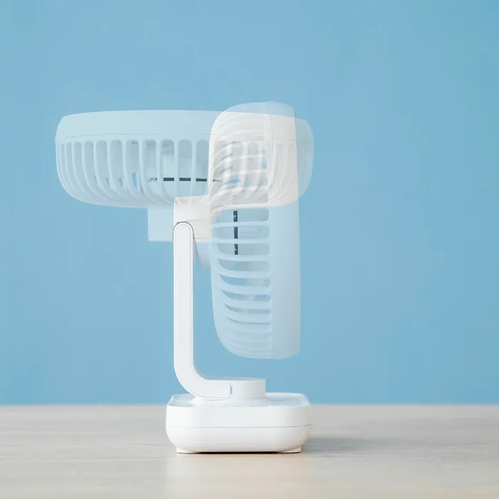our rechargeable desktop fan has an adjustable tilt of up to 90° to direct fresh air in the optimal position. It features 4 anti-slip rubber feet on the base. For cleaning, the front blade guard can be removed in one simple movement.