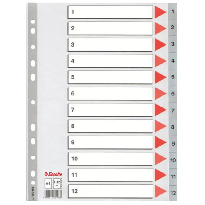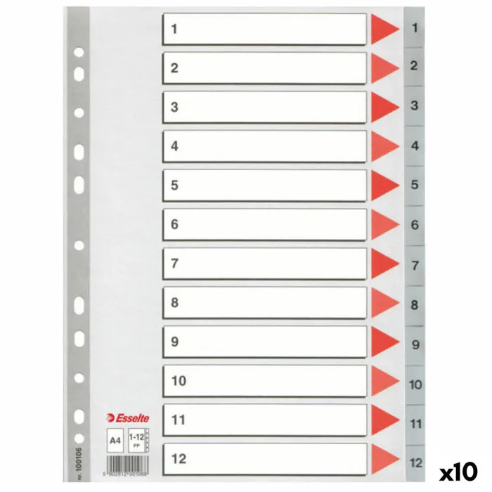 The innovative design features drilled holes for easy insertion into binds or folders, facilitating effortless organization. When you return to the office, impress your colleagues with your impeccable organization skills, made possible by utilizing the Seperators Esselte Numbered Grey A4 12 Sheets (10 Units). Whether you are preparing reports, presentations, or simply managing paperwork, these separators are an essential tool for anyone looking to elevate their organizational game and make their workspace a masterpiece of order.