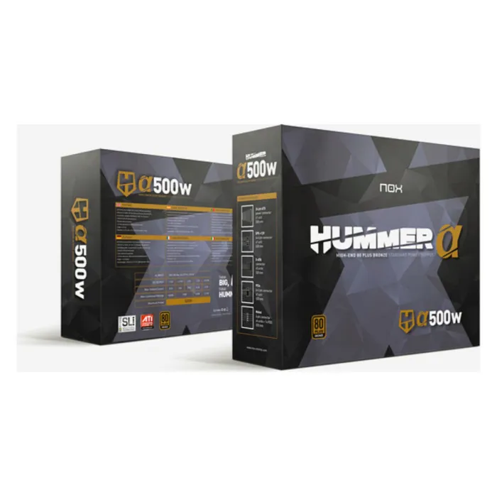 One of the standout features of this power supply is its 80 PLUS Bronze certification, ensuring a remarkable energy efficiency rate of up to 85% when operating at maximum load. This certification signifies that the NOX NXHUMMERA500WBZ is built to minimize energy waste, providing you with a cost-effective solution for your computing needs while reducing the environmental impact. With a total output of 500W, this power supply is capable of handling demanding tasks without compromising stability. Whether you're gaming, rendering, or multitasking with resource-intensive applications, you can trust in the reliability of the Hummer Alpha.