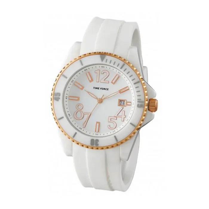 The design of the Ladies'Watch Time Force TF4186L11 focuses on comfort and durability. The strap is crafted from natural rubber, providing a soft touch against your skin while being resilient enough to withstand daily wear. Its white color adds a fresh and vibrant touch to your wrist, making it a versatile piece for any occasion. The watch case, made from high-quality plastic, not only enhances durability but also contributes to the lightweight feel of the watch, allowing you to wear it throughout the day without discomfort.