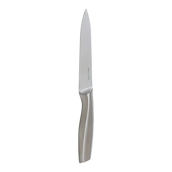 If you are passionate about cooking and take pride in presenting exquisite dishes, the Kitchen Knife Secret de Gourmet Silver Stainless Steel 24.5 cm is an essential addition to your kitchen arsenal. This premium knife, crafted from high-quality stainless steel, ensures exceptional durability and a sleek appearance. The subtly chromed finish not only enhances its aesthetic appeal but also provides excellent resistance to tarnishing and corrosion, ensuring it stays in pristine condition even after prolonged use. With a blade length of 24.5 cm, this knife strikes the perfect balance between precision and versatility, making it suitable for various culinary tasks.