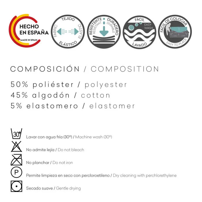 One of the standout features of the Eysa ULISES cover is its adaptable fit, suitable for 1-place seating. With approximate dimensions of 80 x 100 x 90 cm, it wraps snugly around your chair, maintaining its structure and elegance, while the two-piece design makes it easier to apply and remove. The fabric is dryer-compatible and comes with clear washing instructions, including a maximum wash temperature of 30ºC and a recommendation to avoid bleach for optimal maintenance. It's worth noting that this chair cover is not suitable for sheets, ensuring that it retains its unique character as a dedicated furniture cover, setting it apart from typical throw blankets.