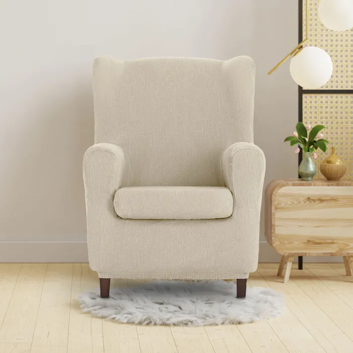 The Eysa ULISES Wingback Chair Cover in a stunning white hue is the perfect solution for those seeking to enhance their interior decor without compromising on comfort or functionality. This elegantly designed cover transforms any ordinary wingback chair into a chic statement piece that complements a variety of design themes, from contemporary to traditional. Made from a high-quality blend of 50% polyester, 45% cotton, and 5% elastomer, it not only offers durability but also provides a plush and soft feel against the skin. Your chair will not only look great but will also be protected from wear and tear, ensuring its longevity and your enjoyment for years to come.