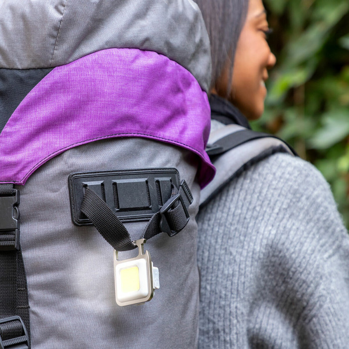 this rechargeable mini LED light has a hole on the top which opens and closes so you can hang it like a keyring on backpacks, trousers, bags, etc. That way, it will always be to hand so you can use it whenever you need to.
