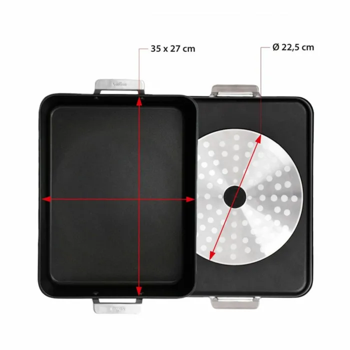 The Serving Platter Valira 4687/25 is an essential addition to your kitchenware that will redefine the way you serve your culinary masterpieces. Crafted with precision in Spain, this exquisite rectangular platter combines functionality with modern aesthetics. Its sleek black surface made from high-quality stainless steel and aluminum not only provides a sophisticated look but also ensures durability and longevity, making it suitable for both everyday use and special occasions. The non-stick feature allows for easy food release and effortless cleaning, giving you more time to enjoy your meals and less time worrying about the aftermath of hosting.