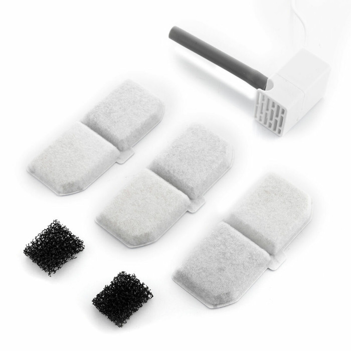 An automatic drinking water fountain for pets consisting of several components which are easily assembled by following the instructions included. It includes adhesive tape to hold the lid and container together during transport. The 2 sponge filters for the pump are washable and reusable. The 3 filters for the water outlet have an approximate life of 3-4 months each. It can also be used without filters.