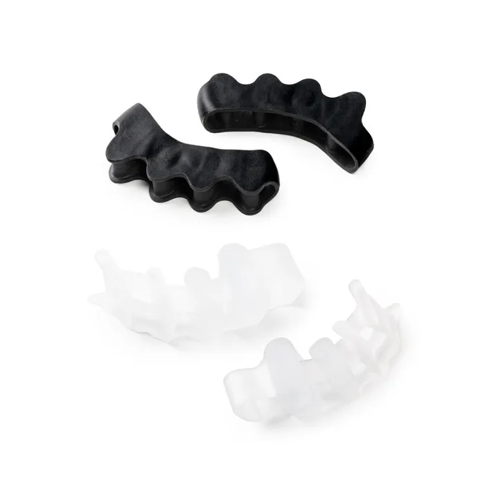 these silicone toe separators come in different shapes, colours and firmness. The wide profile transparent pair is larger and has a wider toe separation (particularly for the big toe). The black pair with a flat profile is smaller, extra-soft, with a natural separation and even distribution of the toes. Â