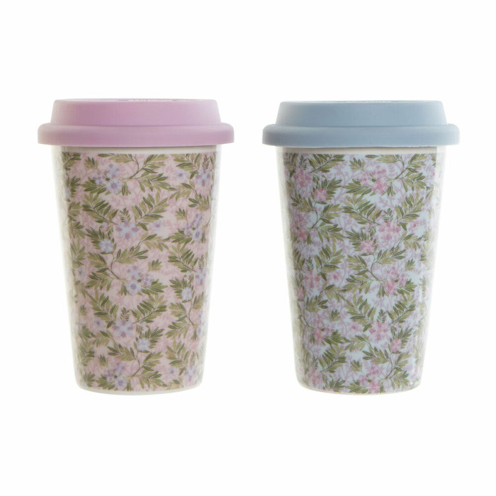 Mug DKD Home Decor Blue Green Pink Silicone Porcelain Flowers (400 ml) (3 pcs)