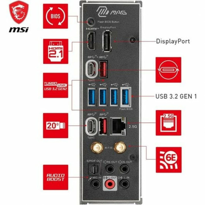 USB-C, RJ45, USB 3.2, HDMI 2.1, M.2, Sata II, HDMI x 1, Microphone, USB 2.0 x 4, Ethernet LAN, SATA x 4, HDMI 2.1 x 1, USB-C 3.2 x 1, 4 x USB 3.2 Gen 1 (3.1 Gen 1), 2 x USB 3.2 Gen 2 (3.1 Gen 2), PCI Express x16 2.0, DisplayPort x 1, USB 3.2 x 1, USB 2.0 x 2, RJ45 x 1