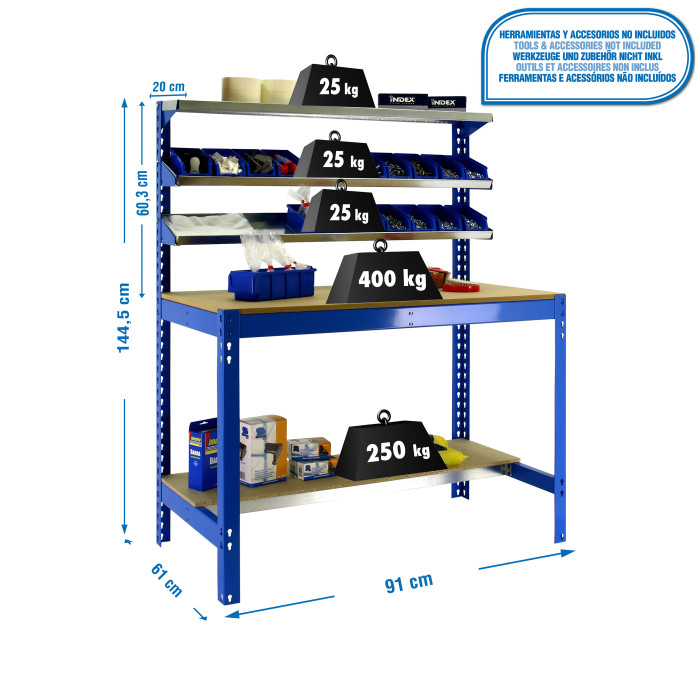 The 5 shelves of this workbench offer great versatility. Each can support up to 400 kg, meaning you can store everything from heavy power tools, complete toolboxes, to construction materials, spare parts, or small appliances. It's an exceptional space organizer for any job.